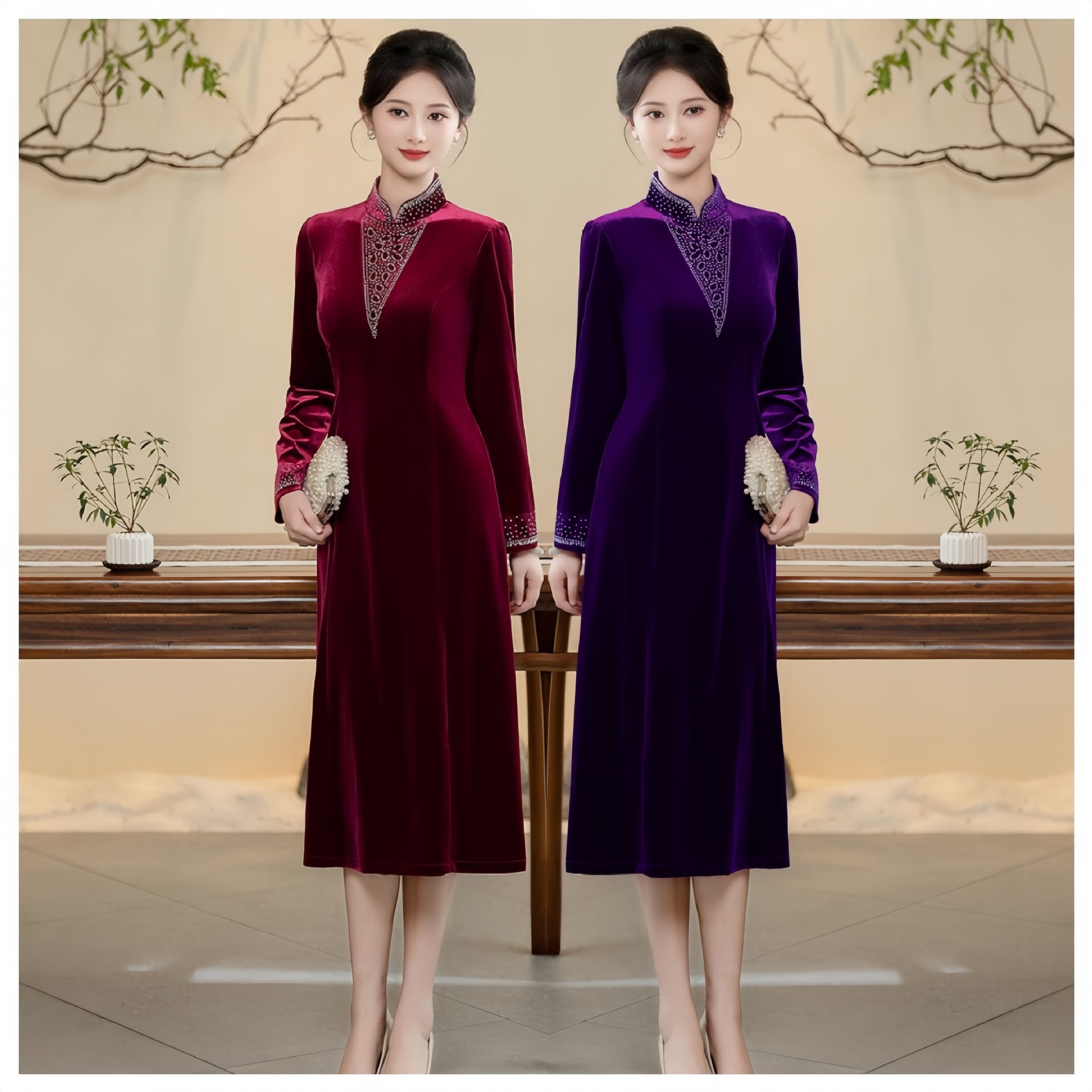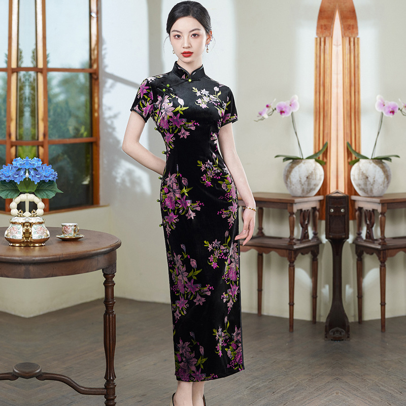2025身を修める長いタイプのベルベットの修身チャイナドレスの若いモデルの新しい気質中国風女装民国復古改良