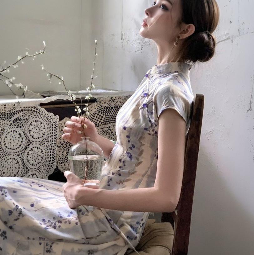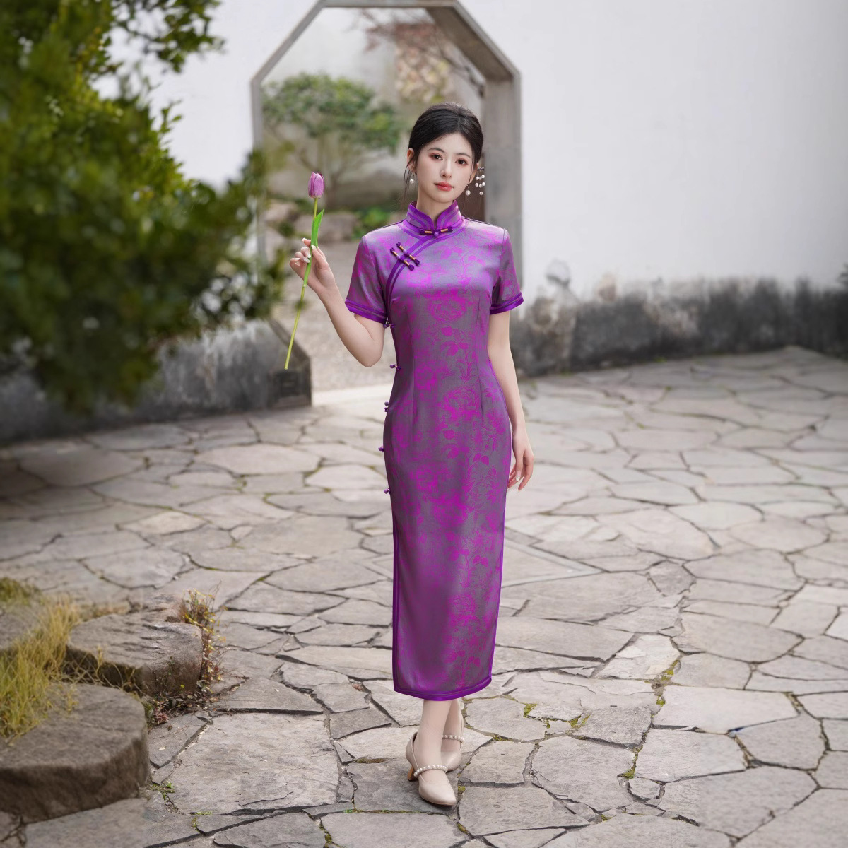 春と夏の新しいチャイナドレス古代中国の新しいスタイル紫色の芸術的な気質ロング改良されたレトロなハイエンドチャイナドレス
