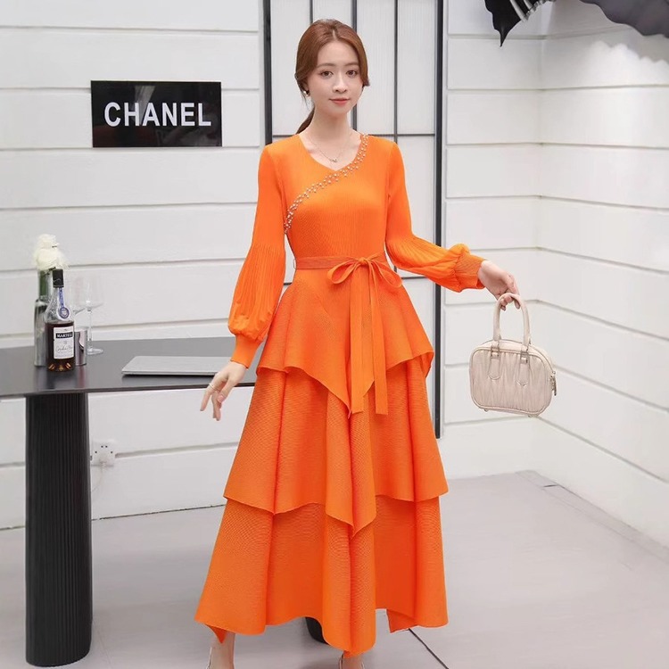 1国境を越えた2025しわ釘珠ケーキのスカートのひもが痩せている腰の高いスピーカーの袖の気質の中の長いワンピース