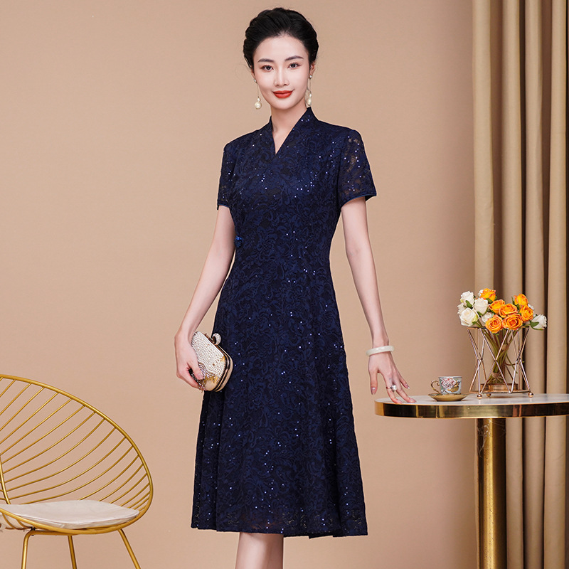 喜母の姑の結婚の宴会のワンピース2025年のレースのスパンコールのチャイナドレスのvネックのドレスの女性は日常的に着ることができます。