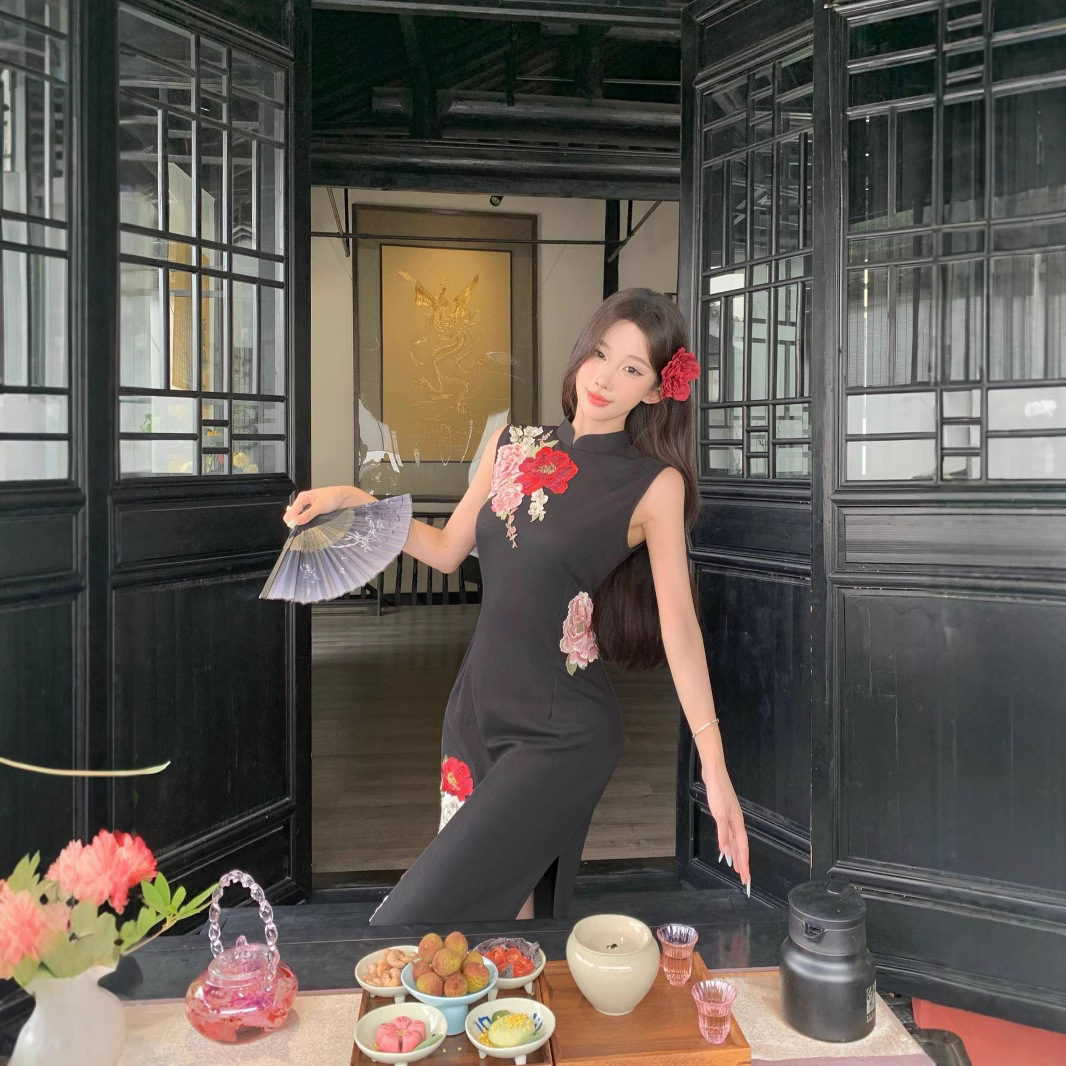 黒の旗袍風高級2025年新作、華麗な中国風刺繍入りワンピース、新中式、ウエストシェイプ、夏の中国風刺繍