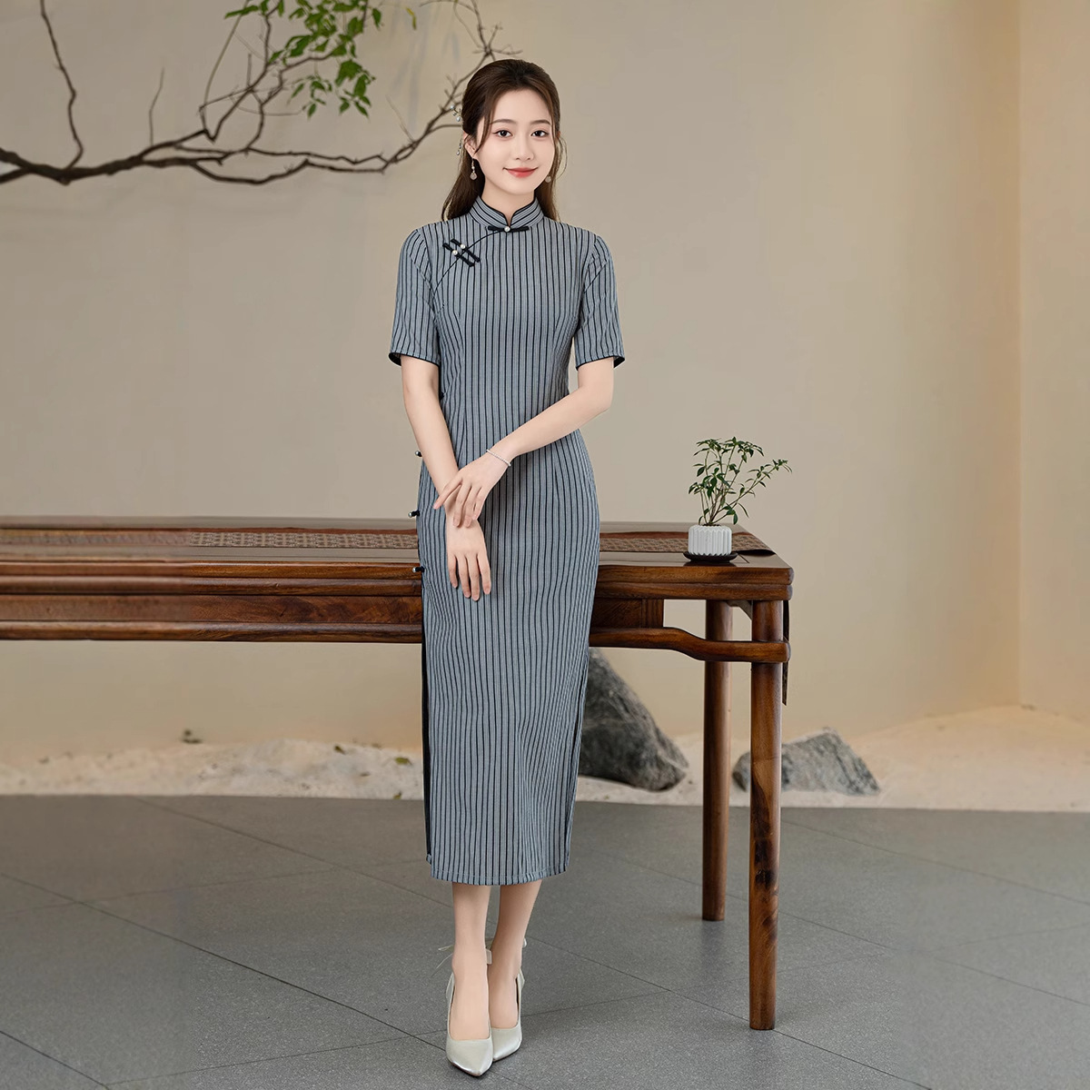 2025夏の新型ポリエステル綿単層文芸風女性チャイナドレスは復古民国風五分袖長チャイナドレスを改良した