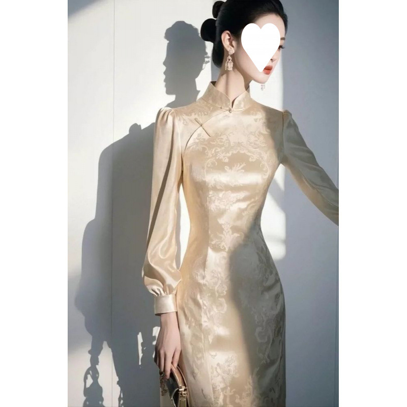 新しい中国風のチャイナドレスは、高級感、美しく、ユニークな気質、ウエストを細くするシャンパンカラージャカードドレス、女性の春用に改良されました。