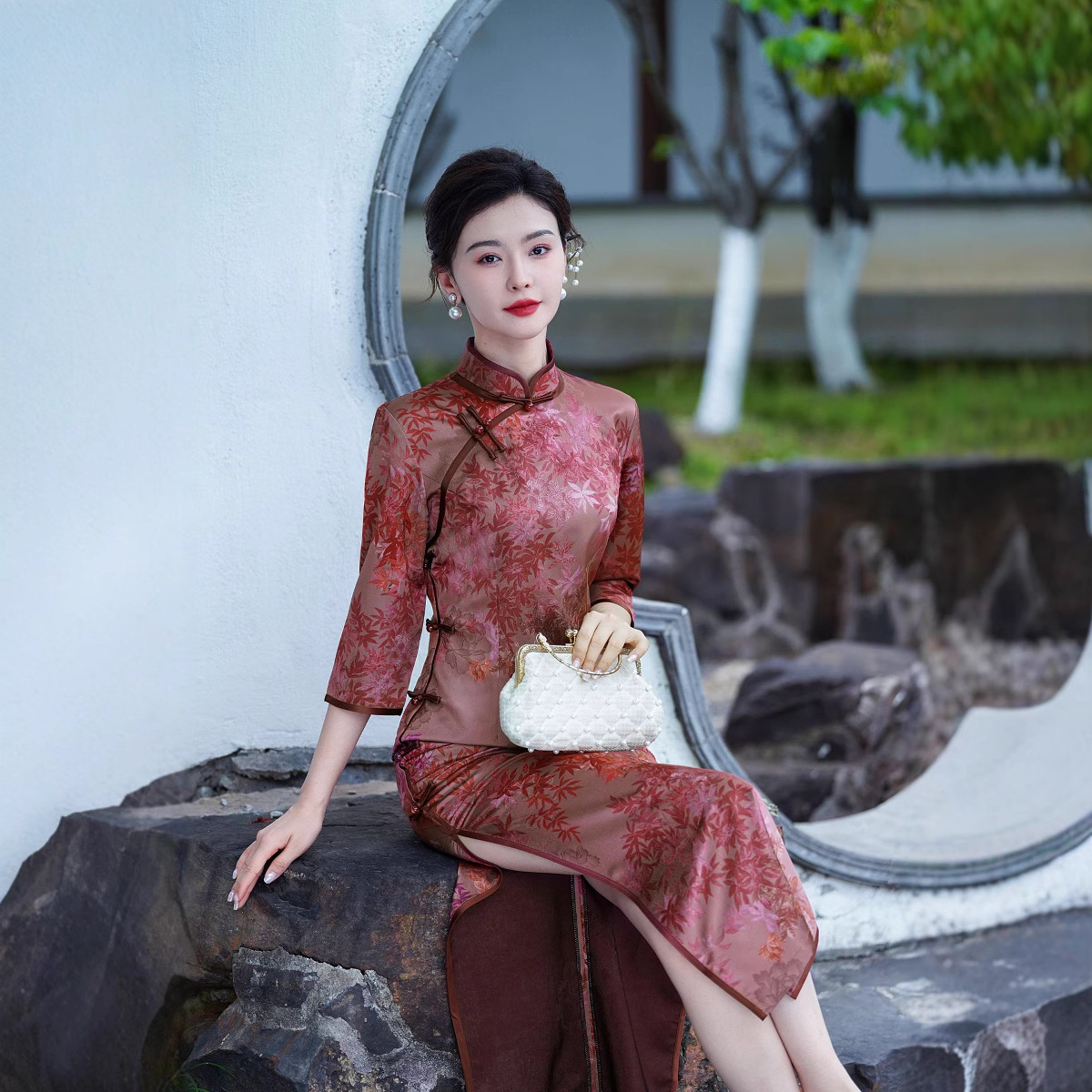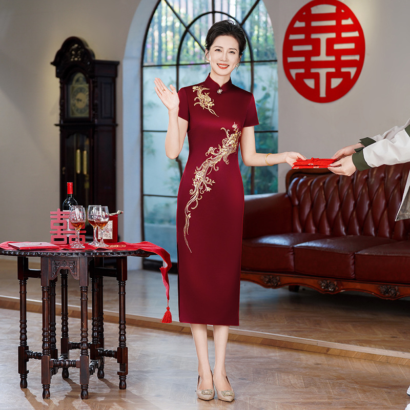 結婚式の宴会中年母親のドレスハイエンドバーガンディレトロミドル丈チャイナドレス高貴でエレガントな義母のウェディングドレス