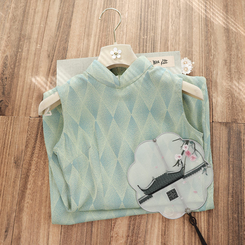 美しい娘の魚の緑色の復古の新しい中国式の袖なしの格子のチャイナドレスの女性の2025春夏の新型の日常は若い金を着ることができます。