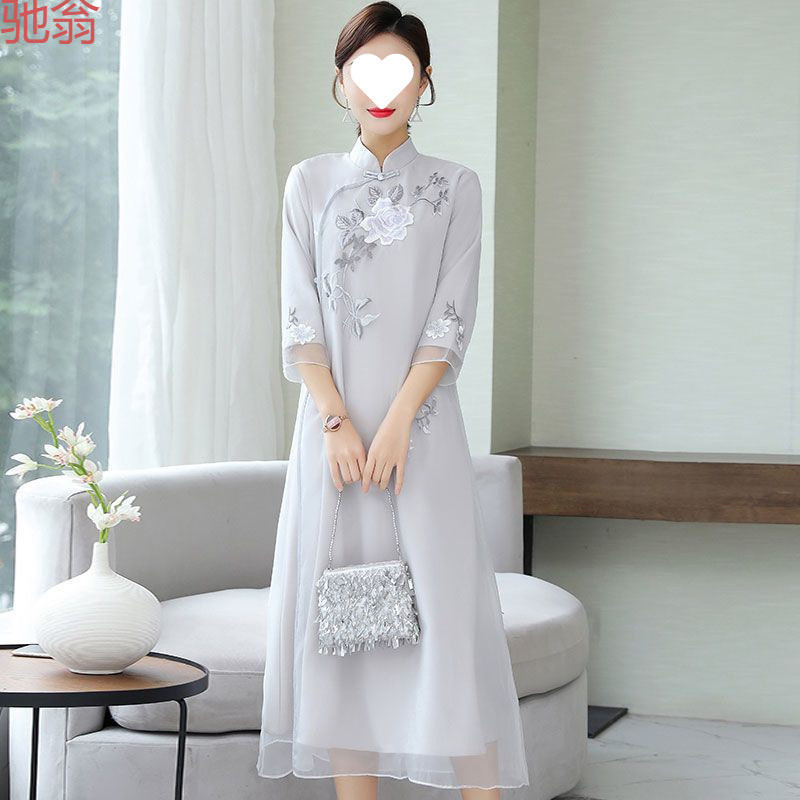 新しい中国式の復古風のチャイナドレスのワンピースの女性の夏の新型のデザイン感の小さい大衆の改良版の修身の中で長いスカート