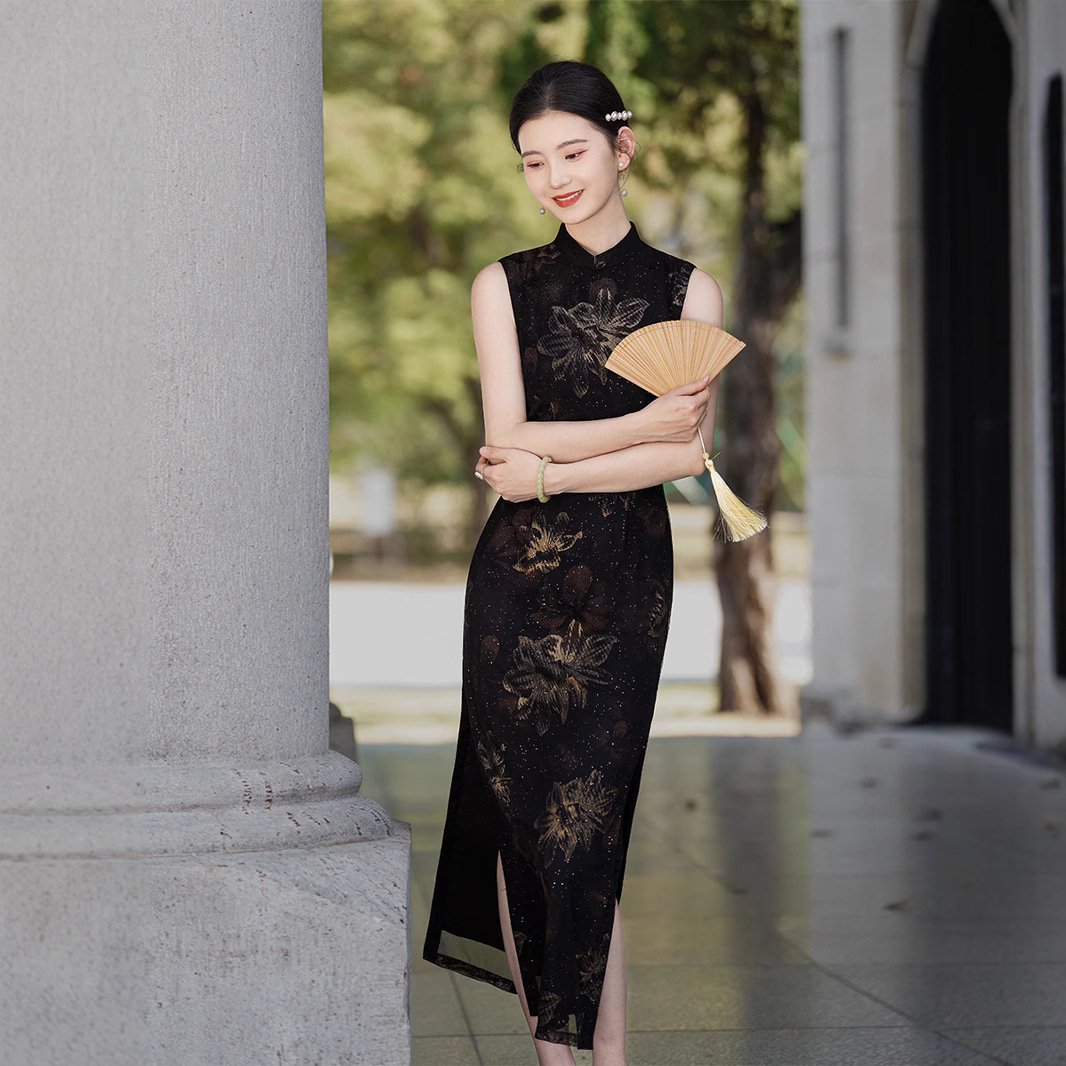 新中国式高級感黒金ノースリーブチャイナドレス女性改良日常気質レトロ蘇州2025夏新作ロング