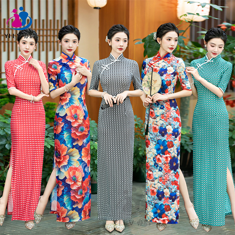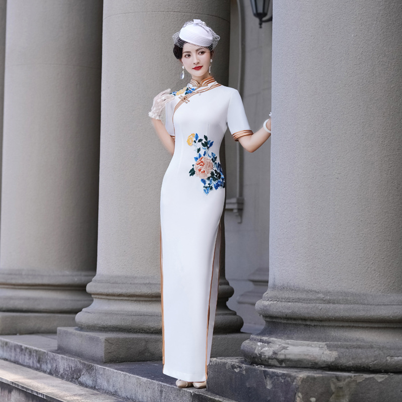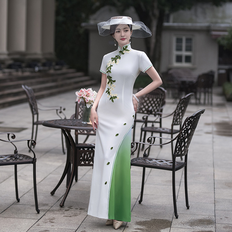 宴会用旗袍、ロング丈、伸縮性のあるスリムフィット旗袍ワンピース、レトロ改良型スリムフィットドレス、若いスタイル