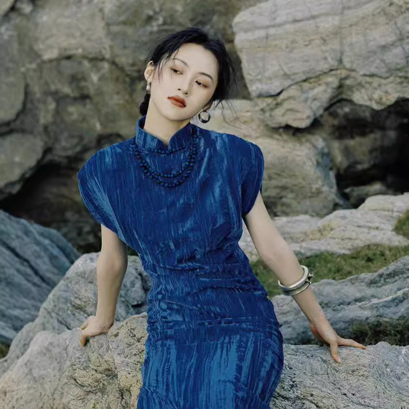 2025年春夏新作 国風旗袍風 レディースロングドレス ブルー シルクサテンワンピース スリムフィット おしゃれ 宴会向け 卸売