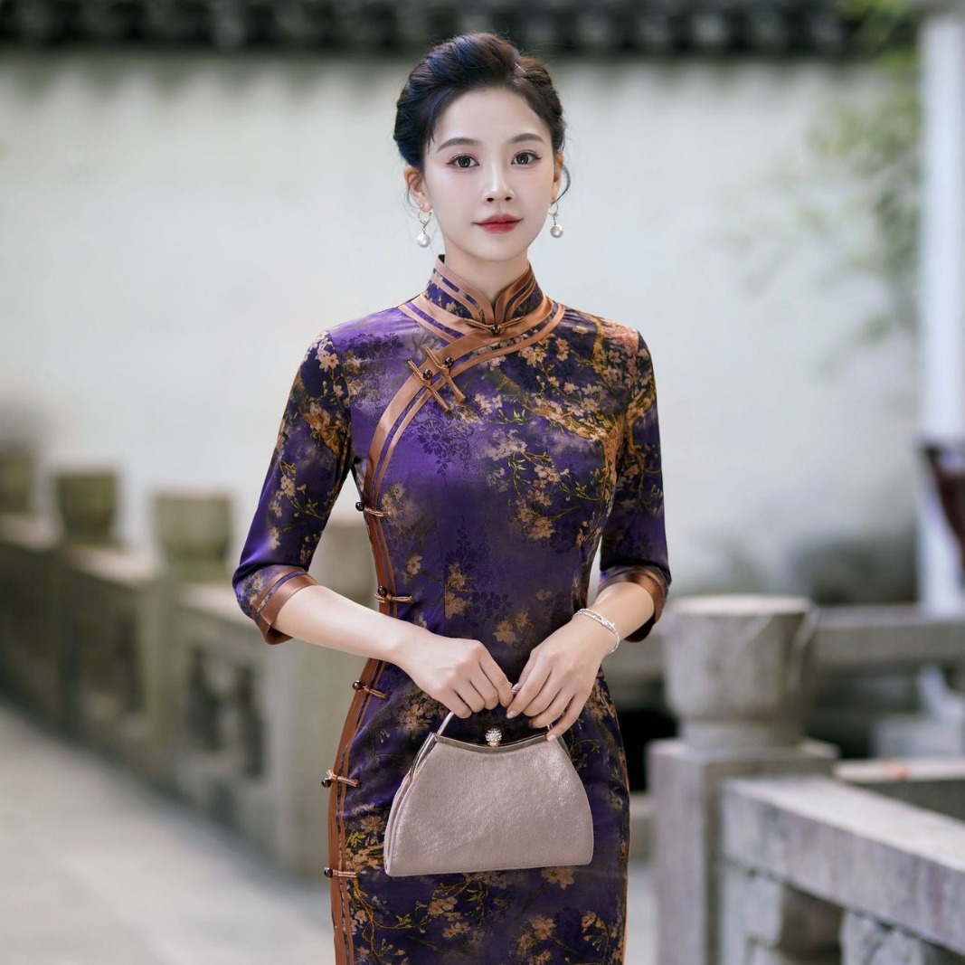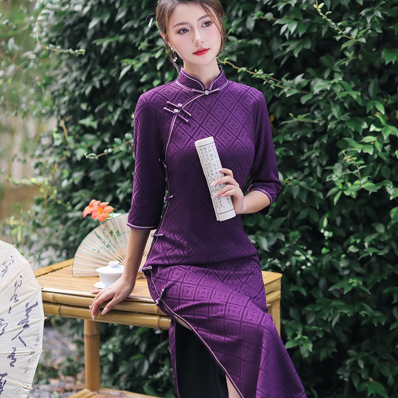 2021秋冬新作改良九分袖ミディアムロング丈レトロスタンドカラー日常ビッグサイズマザーズチャイナドレス