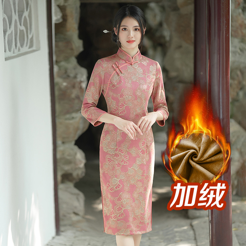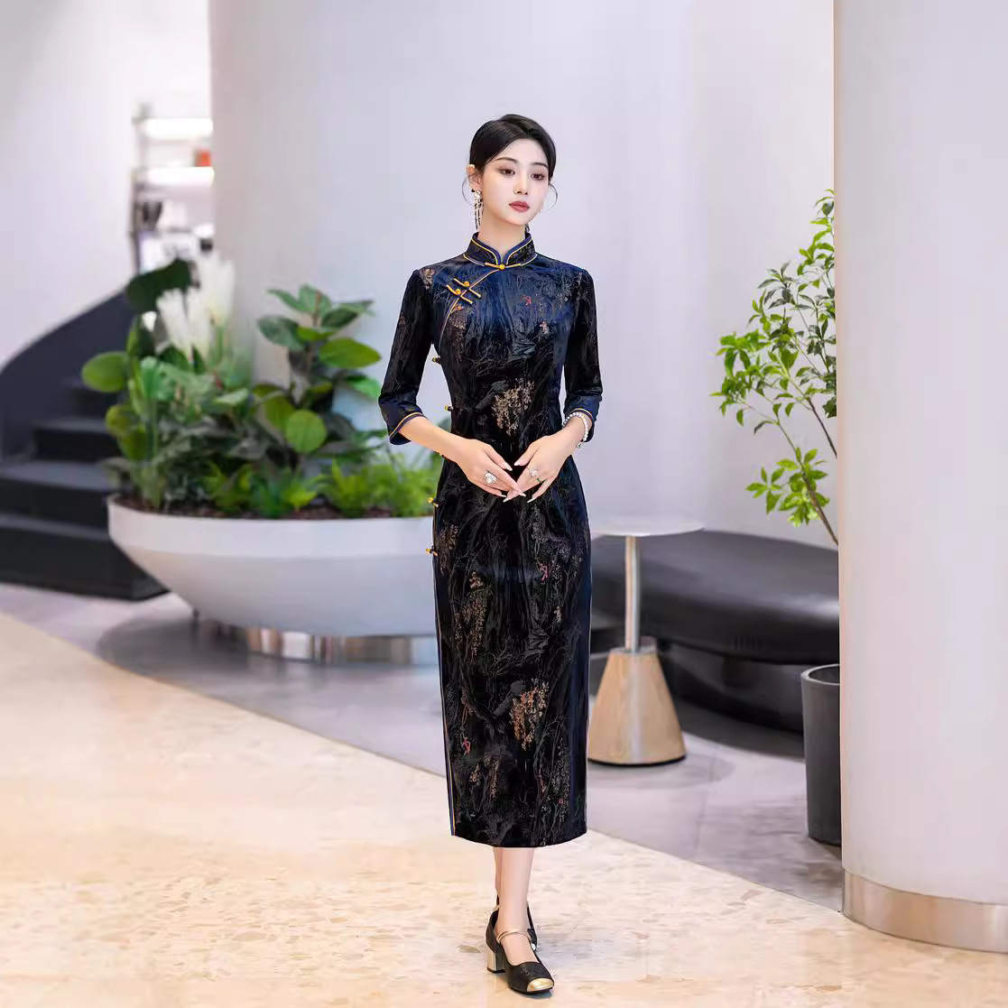2022年の新型冬のベルベットのチャイナドレスの長袖スエードのベルベットの金のチャイナドレスの改良スカートの伝統的な中長のチャイナドレス