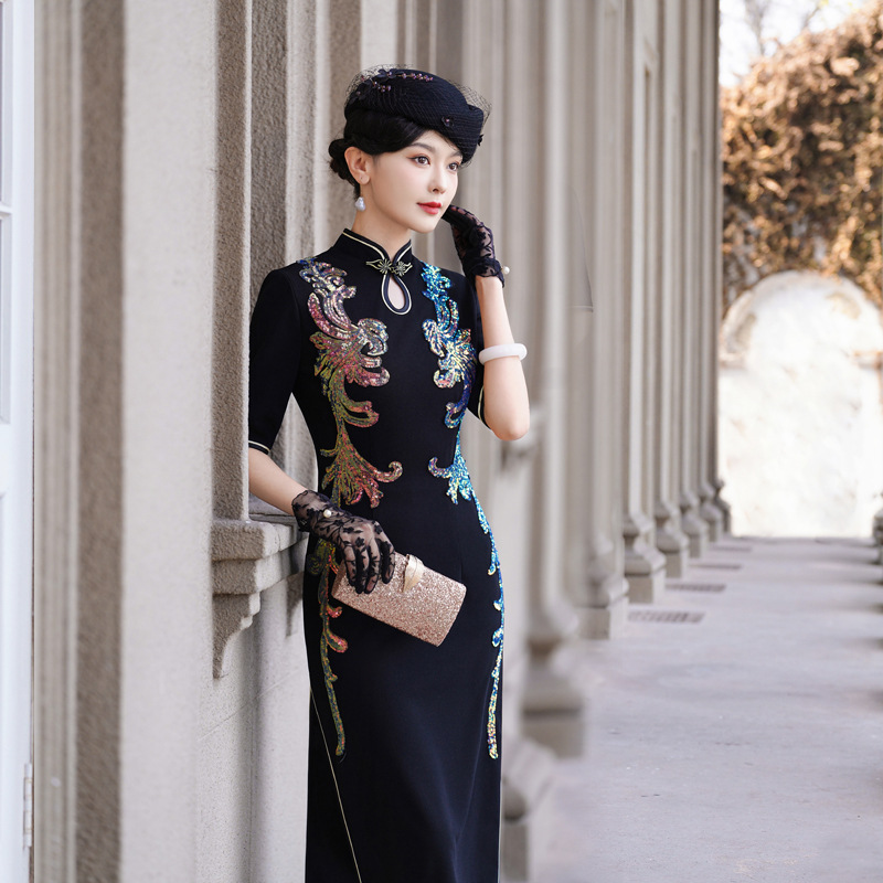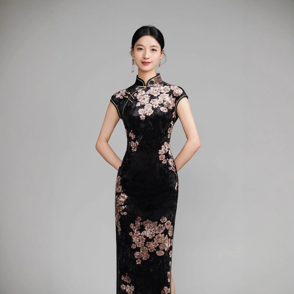2025新型の黒いベルベットのレトロな宴会のチャイナドレスのロングタイプ