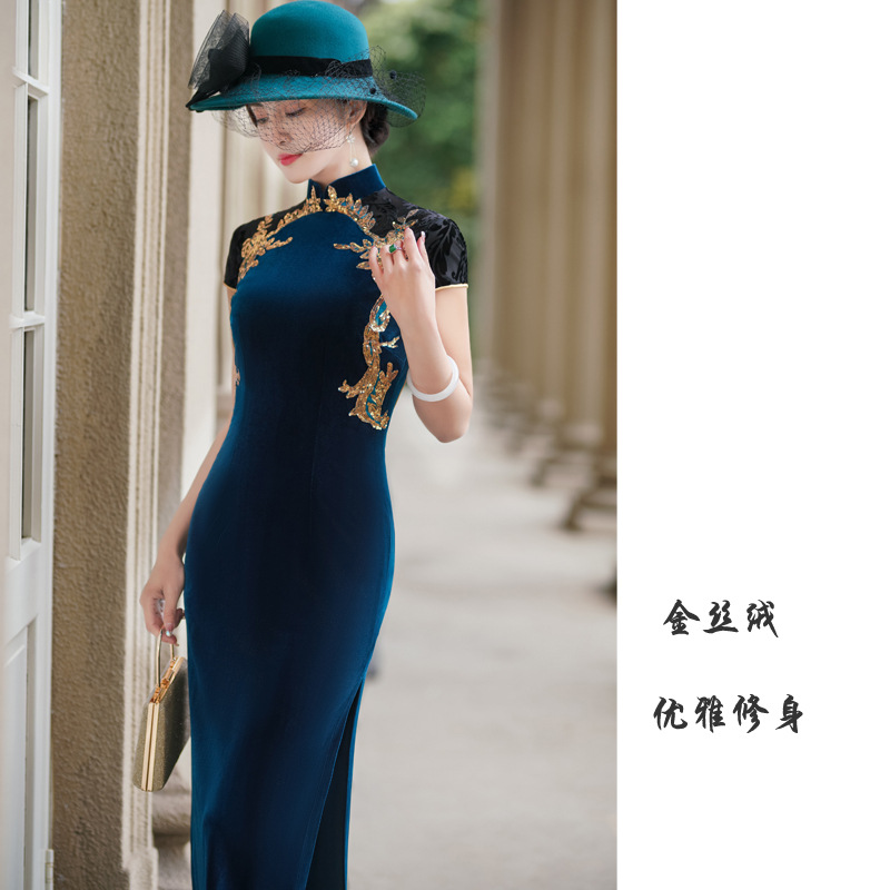 金糸ベルベット旗袍 秋の新作 レトロ改良型 ハイカットスリット 気質アップ スリムフィット 新中式ワンピース 演奏会ドレス
