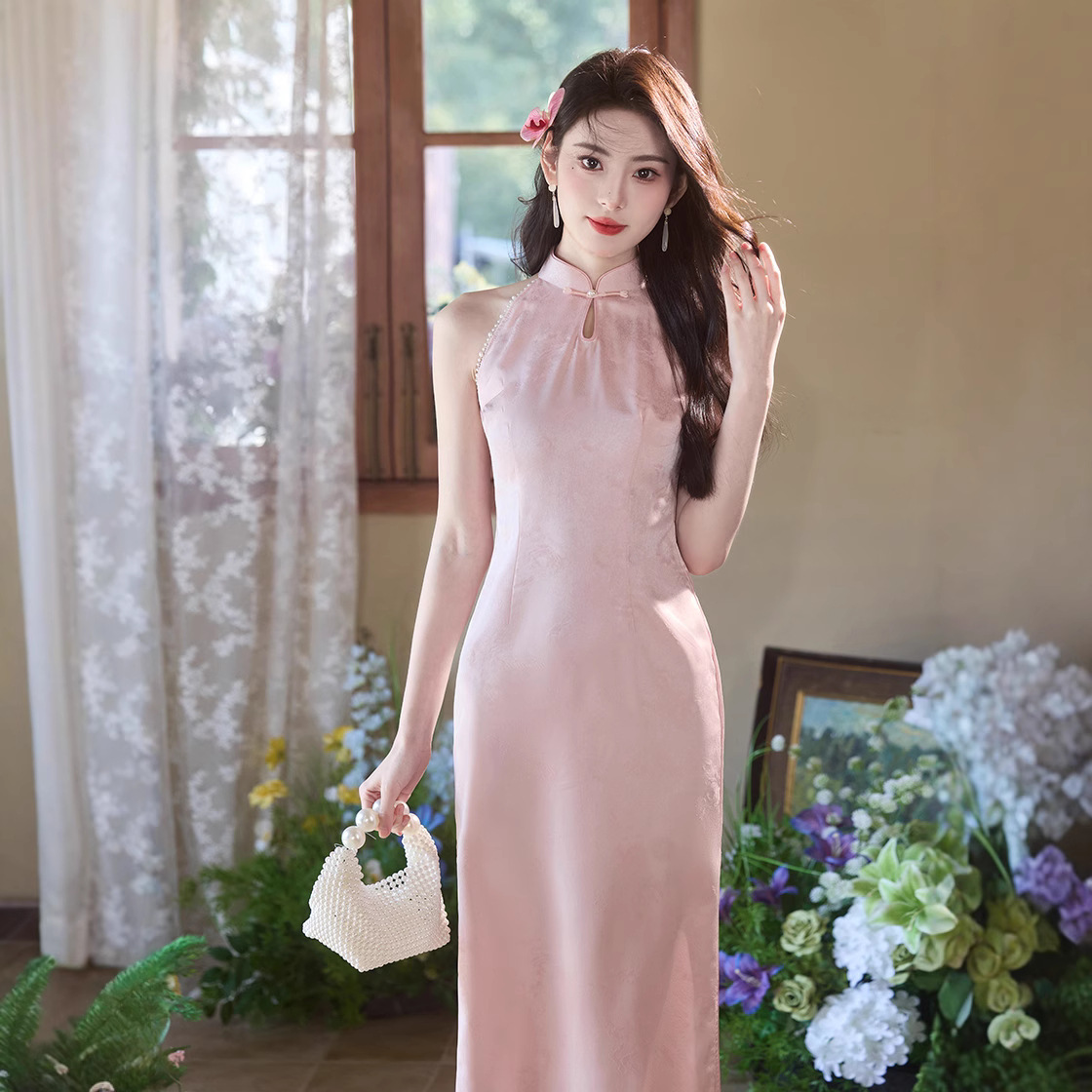 唐愛着2025年新中国式チャイナドレス敬酒服結婚帰門花嫁私服婚約ピンク袖なし首掛け