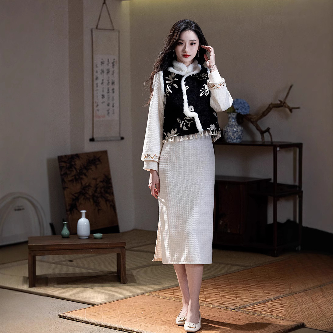 秋冬旗袍風ベストツーピースセット 2025年新作 中華風 女子大生 日常着 エレガント 細見え 黒