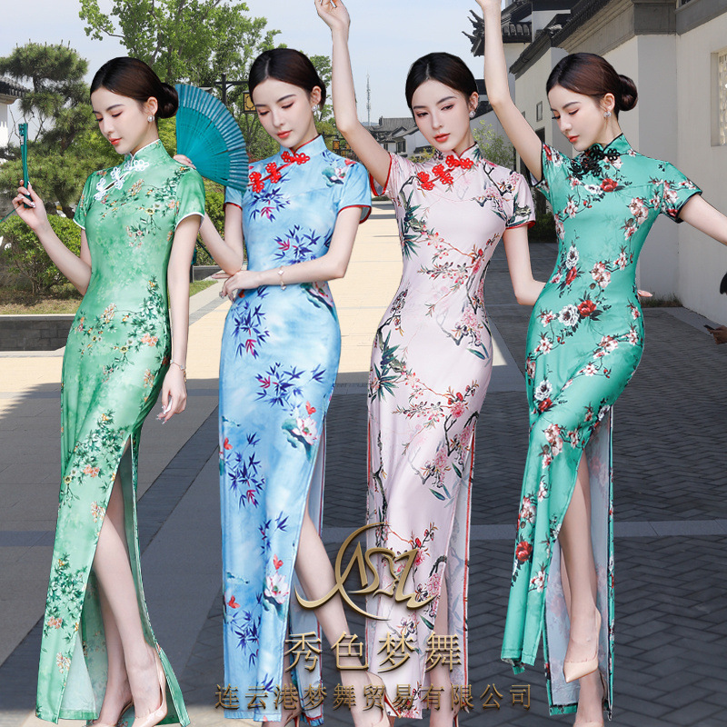 23年春夏新作ショーチャイナドレス女性二重長タイプのチャイナドレスのシミュレーションシルク中国風修身チャイナドレスのワンピース