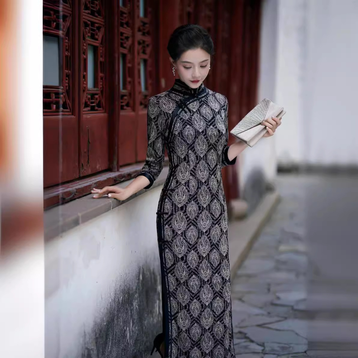 ベルベット刺繍のロングタイプの七分袖チャイナドレス2024冬の新しいレトロな国風新中国式ファッションはチャイナドレスをつなぎ合わせた