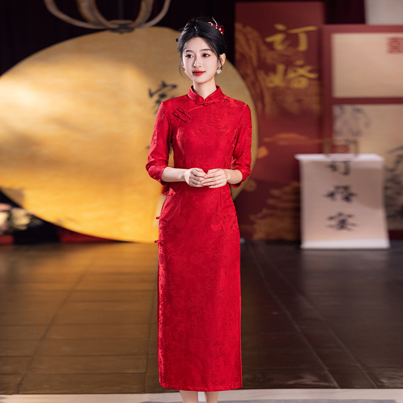 2025年 レッド チャイナドレス ロング丈 中国風 ゴールドベルベット 七分袖 立襟 ウェディング改良版 チャイナドレス