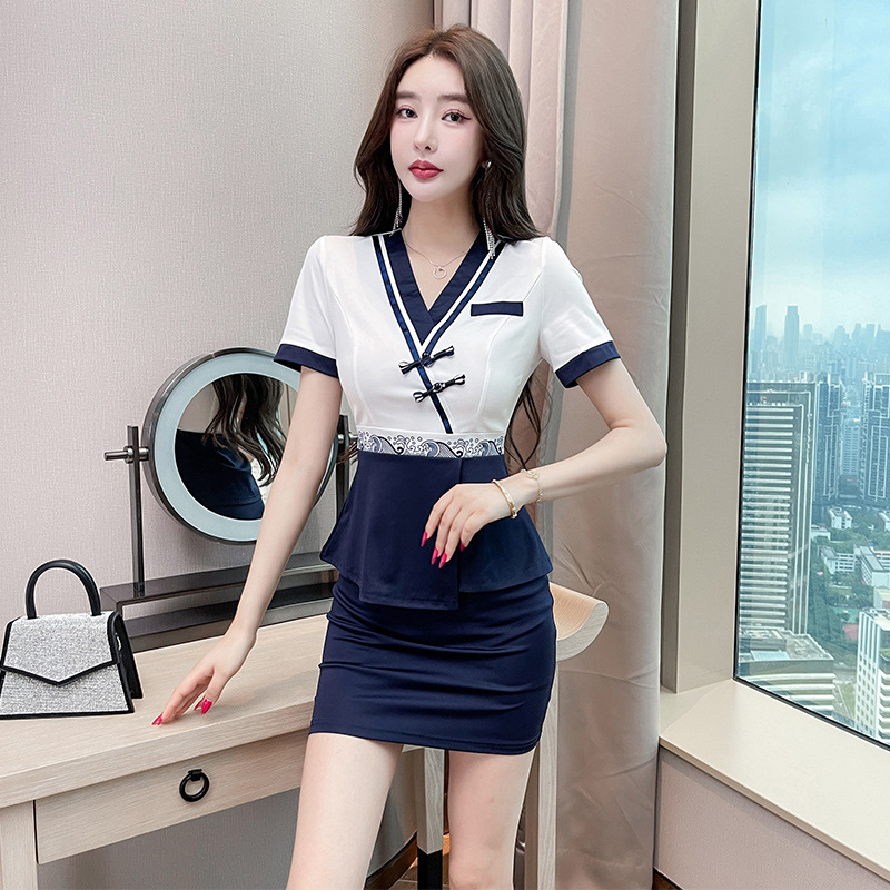 夜場サウナ足浴技師の作業服セクシーな低胸vネックのスリムなお尻3615ワンピース