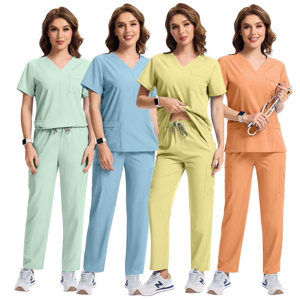 2025新商品の手洗い服12色vネックストレートズボンの薄い夏のカジュアルで快適な看護師服セットの速売通