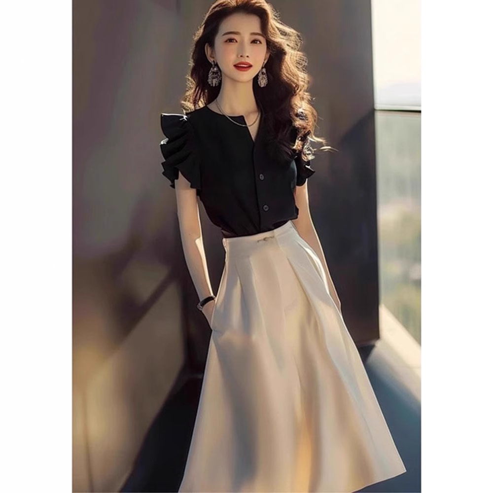 今年人気の女性用美しいスーツスカート2025新しい夏のライトラグジュアリーハイエンド気質ブラックシャツ2点セット