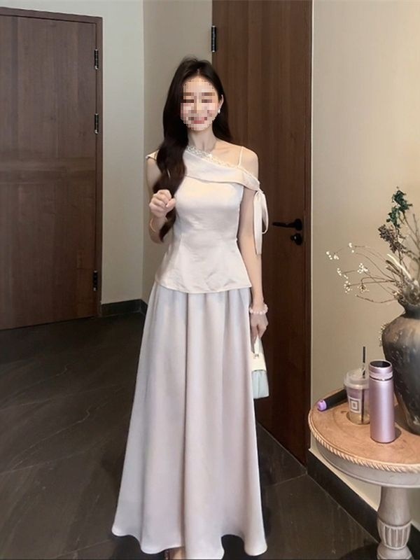 春夏の女性用フレンチスタイルスーツ、斜め肩レースウエストトップスと美しいスカートの2点セット