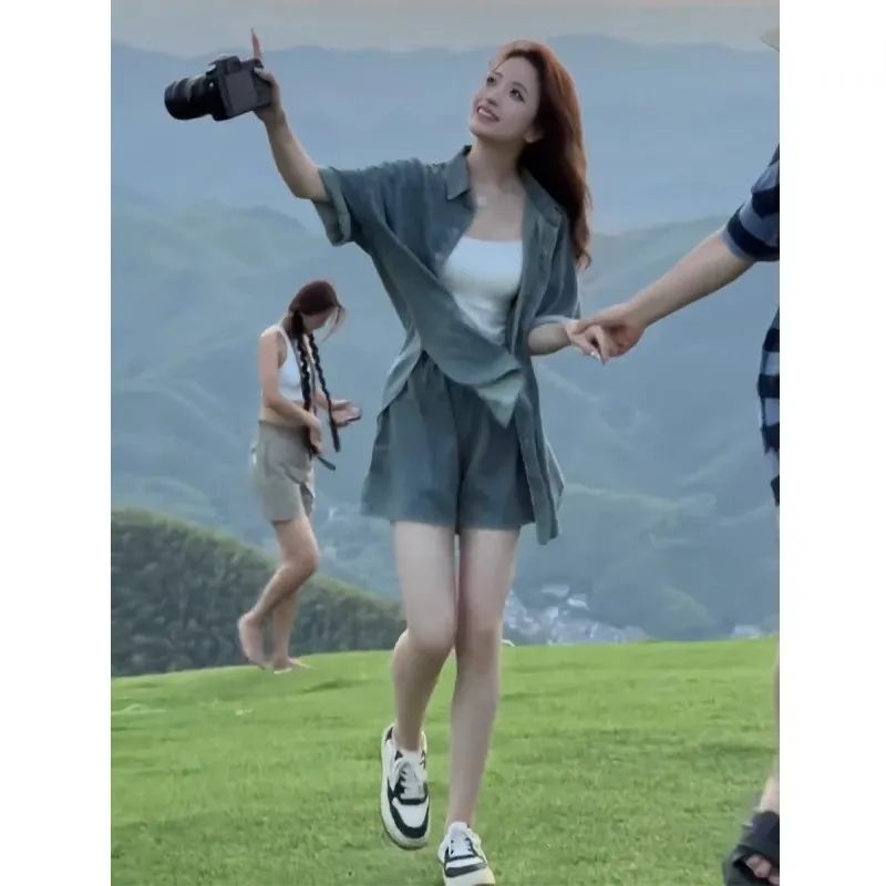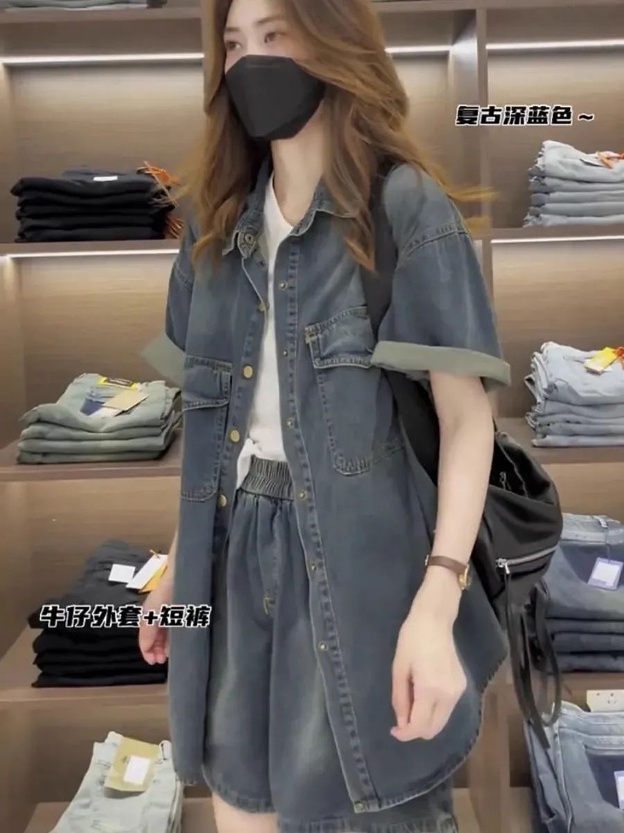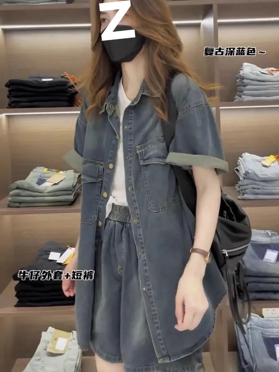 小柄な人向けのネットセレブの2025年夏新作デザインデニム薄手シャツとショートパンツの女性用2点セット