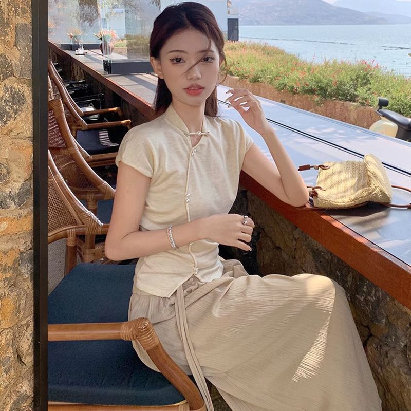 レトロな気質レトロバックルスタンドカラー半袖Tシャツ夏ルーズパンツスカート新しいワイドレッグパンツスーツ女性用2点セット
