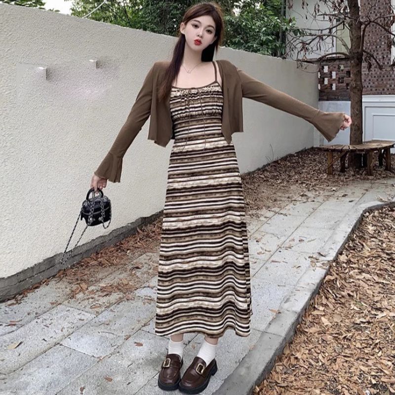 2025年夏無地カーディガンドレス、レトロ、スリム、肉感カバー、通勤ストライプサスペンダースカート、フレンチスーツ