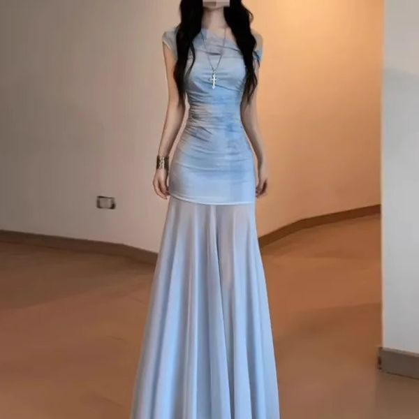 フレンチアイリスブルーチューブトップワンショルダードレス女性の夏の海辺の休暇スタイルオフショルダーメッシュヒップカバーロングスカート
