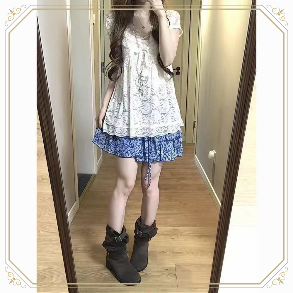 白磁青と白の夏の新しい日本のヴィンテージデザイントップス気質花柄スカート痩身スーツ