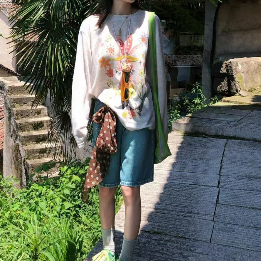 时尚童趣水彩手绘小丑图案印花长袖T恤女装夏季宽松百搭防晒罩衫