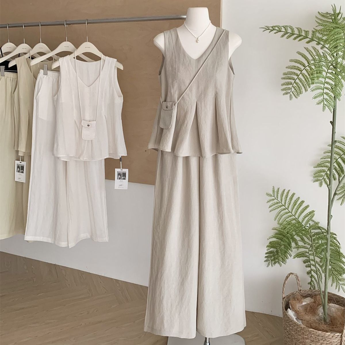 夏にぴったりの美しいコーデ、ゆったりリラックスできるVネックベストトップス、ワイドパンツ、韓国ファッションの女性用2点セット