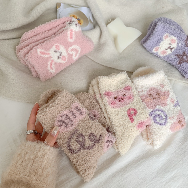 漫画イラストコーラルベルベット靴下女子秋冬中筒靴下家庭保温睡眠床靴下厚いベルベット靴下