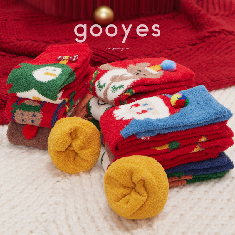 箱付き刺繍床クリスマス靴下プレゼント女性靴下サンゴベルベット厚い保温靴下動物アニメ雪靴下