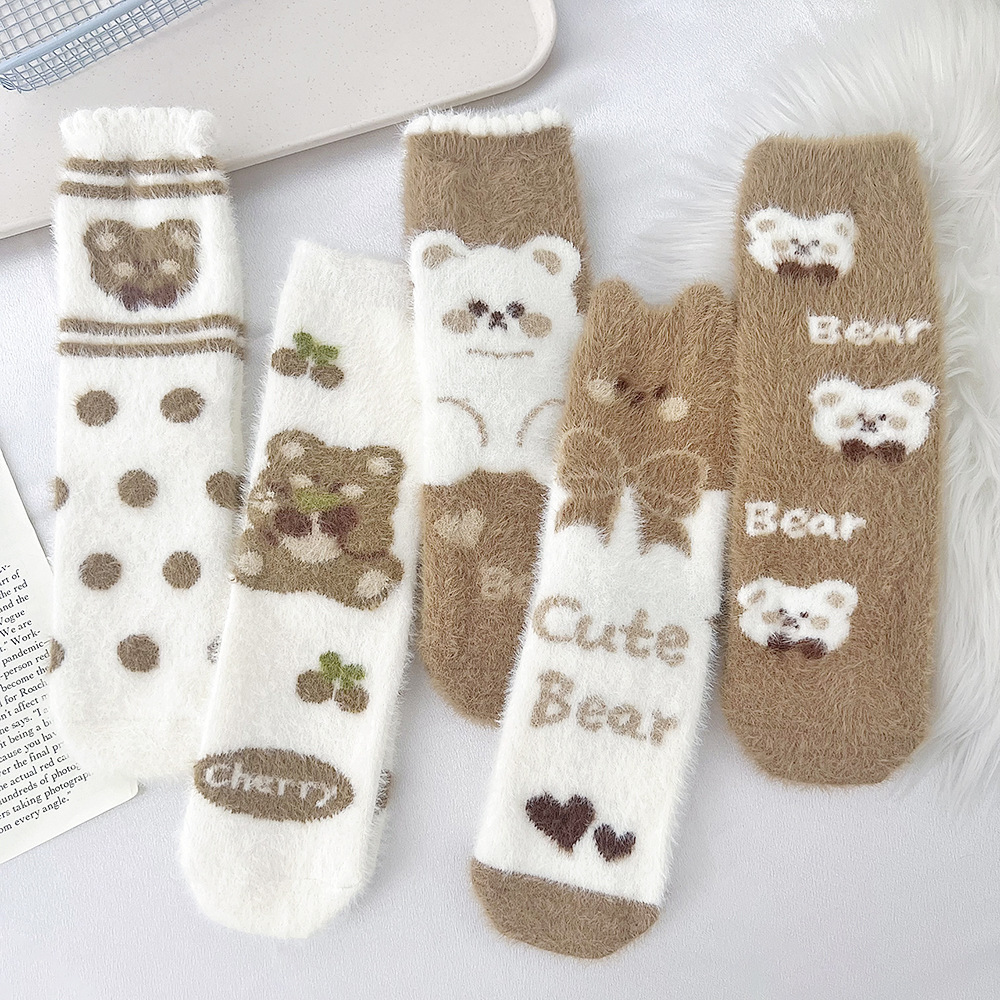 秋冬用コーラルベルベットミドル丈ソックス、厚手で暖かい、半ベルベットソックス、女性用、小さな耳付き、ホームフロアソックス、睡眠用ソックス