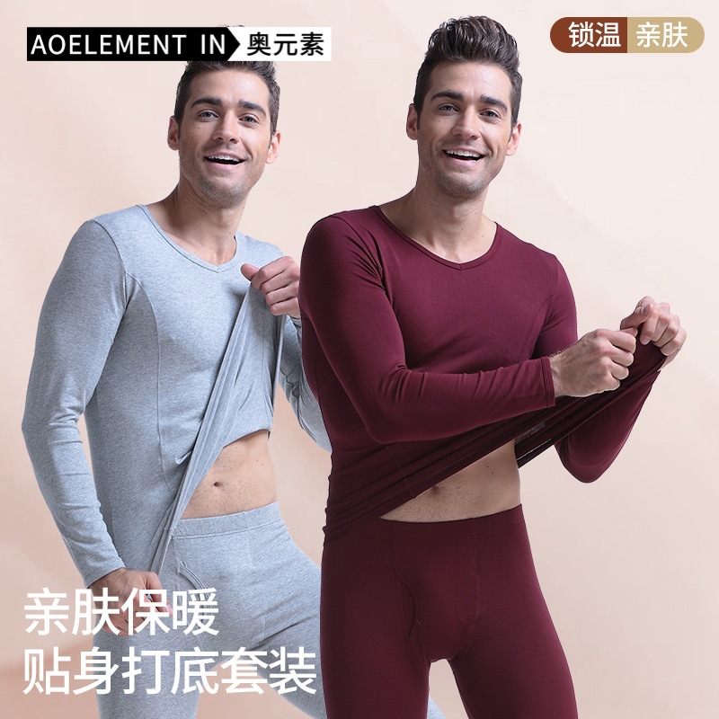 男性用基本保温下着セット 秋用薄手綿毛衣 ローネックVネック スリムフィット ベースレイヤーセット