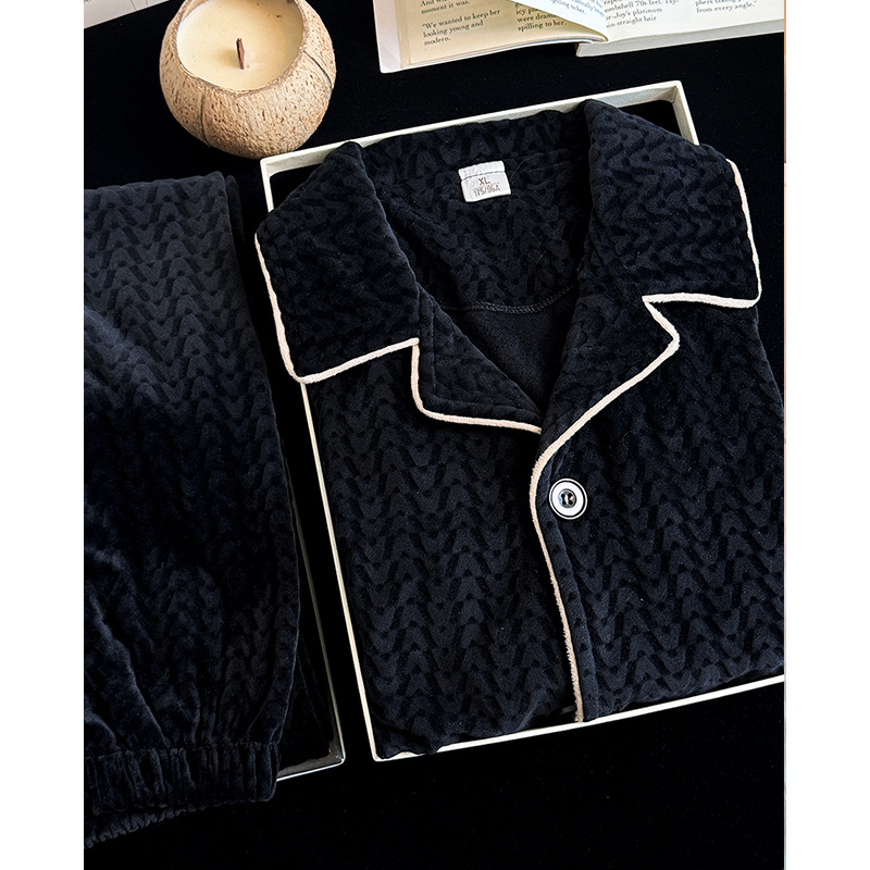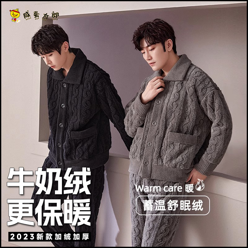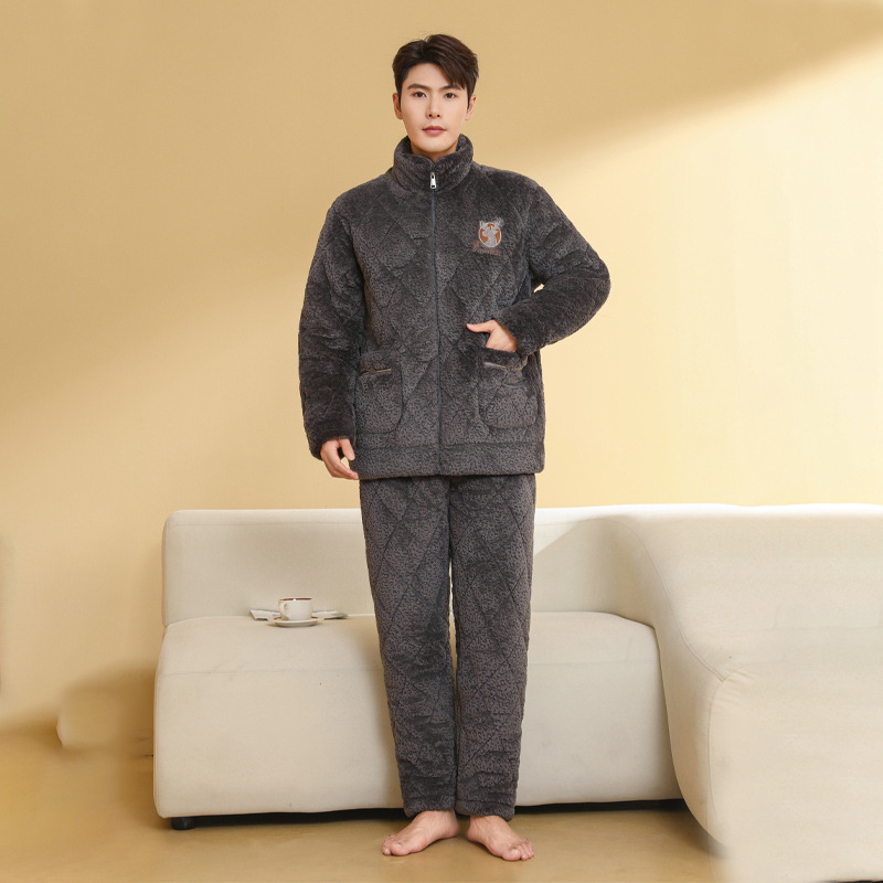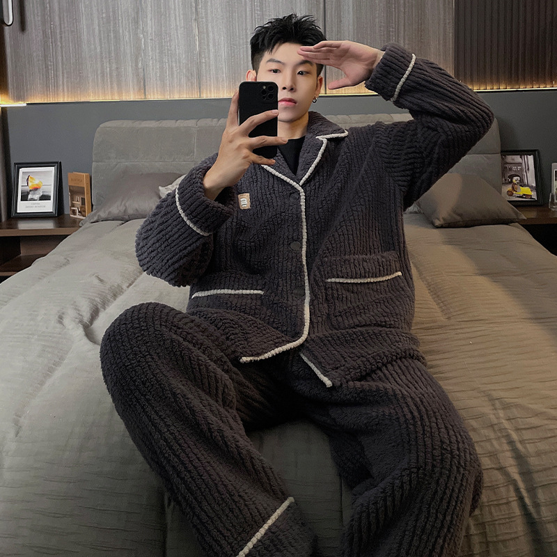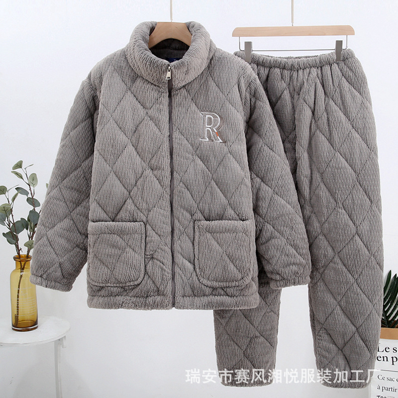 留置場曼子男性秋冬新作パジャマ立襟カジュアル風厚手ホームウェアセット濃いシンプル保温服