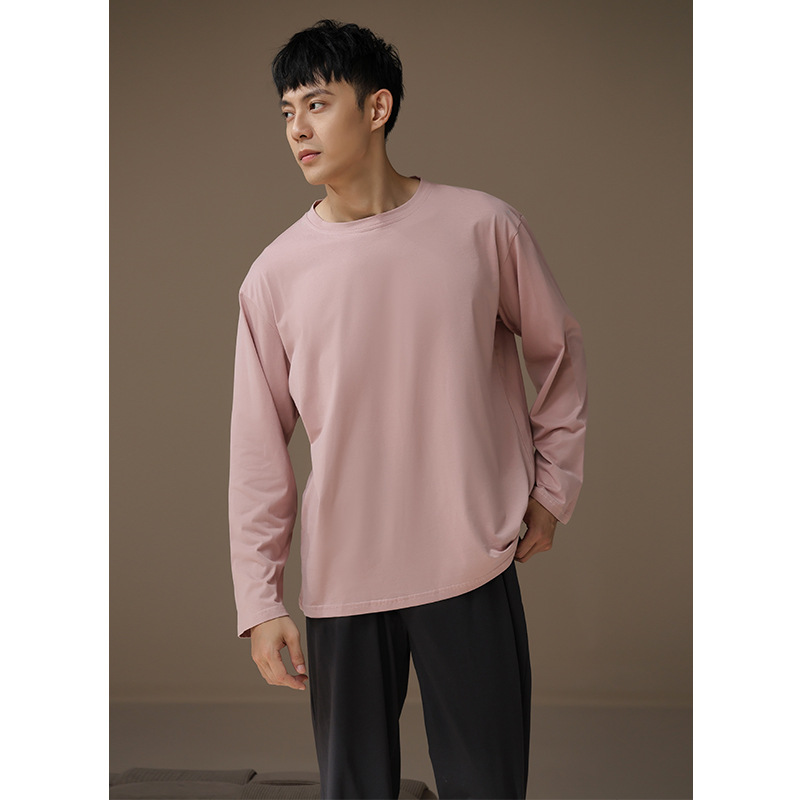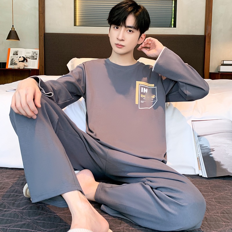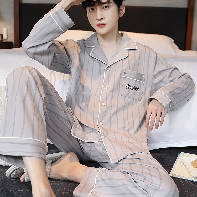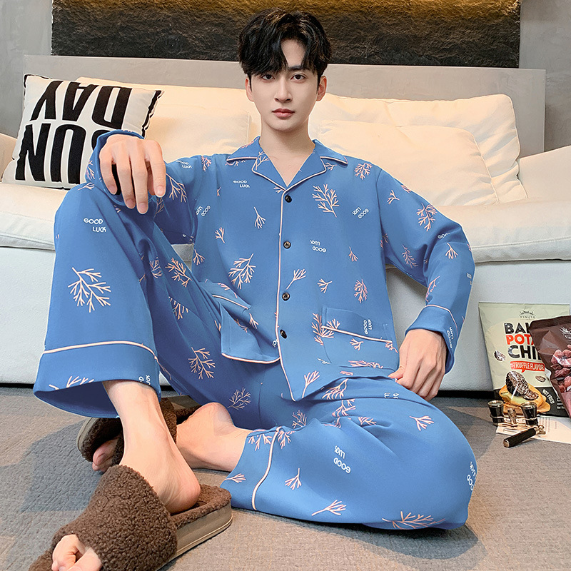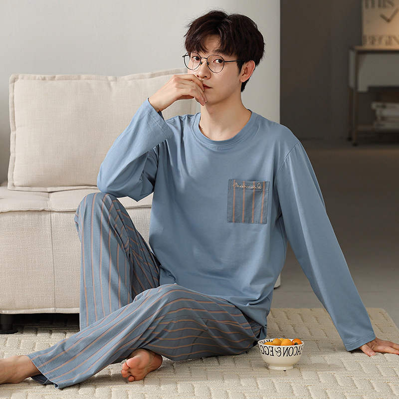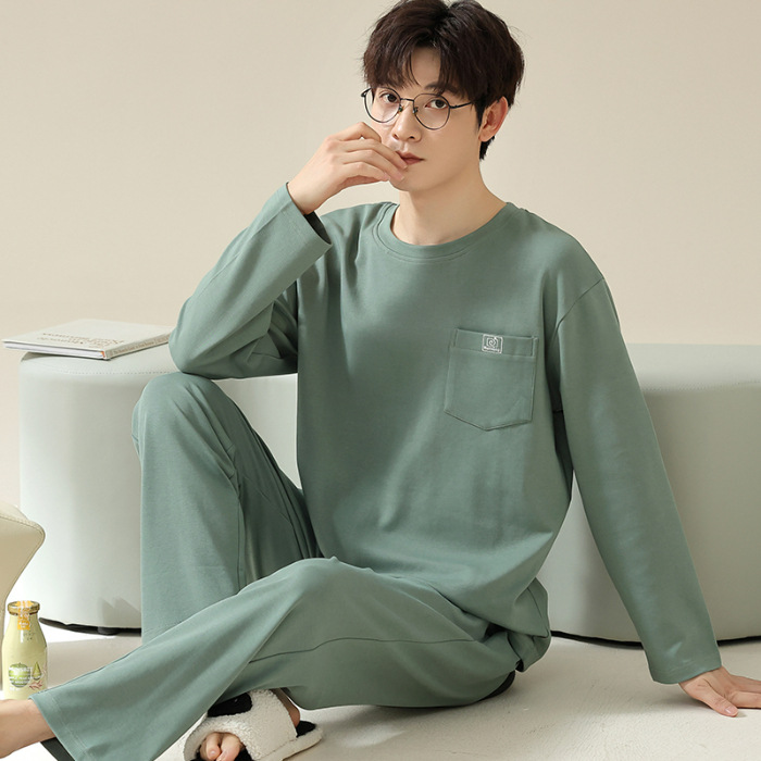 春秋男性パジャマ長袖長ズボン快適綿丸襟韓国版カジュアルコートホームウェアセット