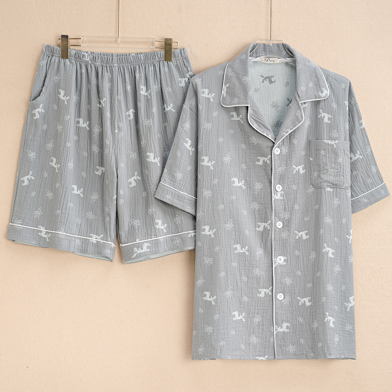 夏のメンズパジャマ二層綿ガーゼ半袖ショーツラペルカーディガンソフトルーズ大きいサイズホームウェア2点セット
