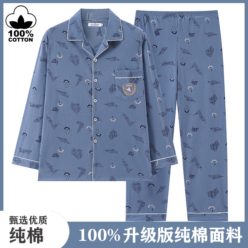 新商品の睦隆世家パジャマ男性春と秋のレカ綿長袖男性モデル秋の大きいサイズのカーディガンの家庭服セット