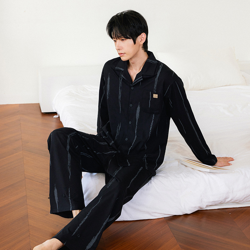 秋の新型シンプル縦紋高級感綿パジャマ男性7a級抗菌黒長袖ホームウェアセット