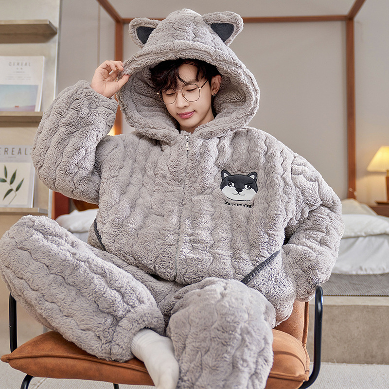 三層綿を挟んだパジャマ男は秋冬にベルベットを厚くしてサンゴのベルベットのジッパーを厚くして帽子の冬の家庭服を着ることができる