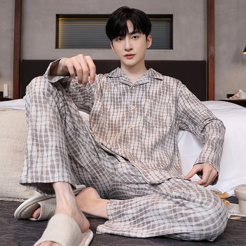高級感純綿パジャマ男性春と秋の長袖カーディガン