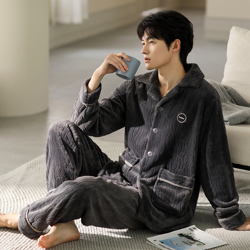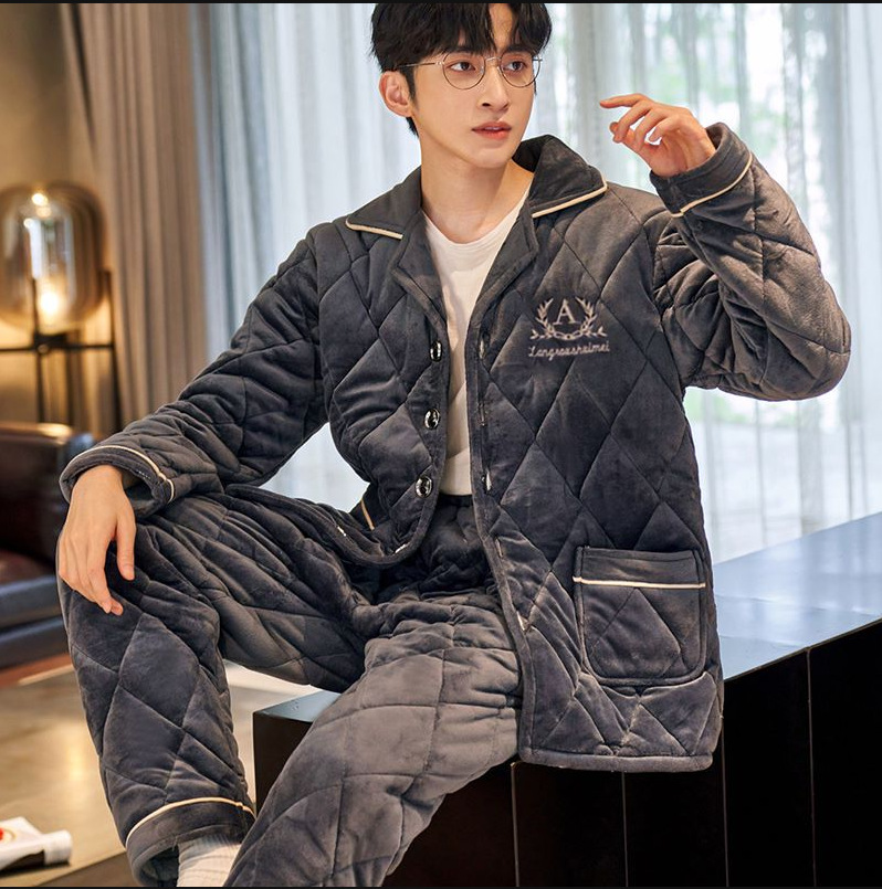 冬用コーラルフリース三層保温綿入りメンズホームウェア長袖襟付きパジャマセット厚手保温