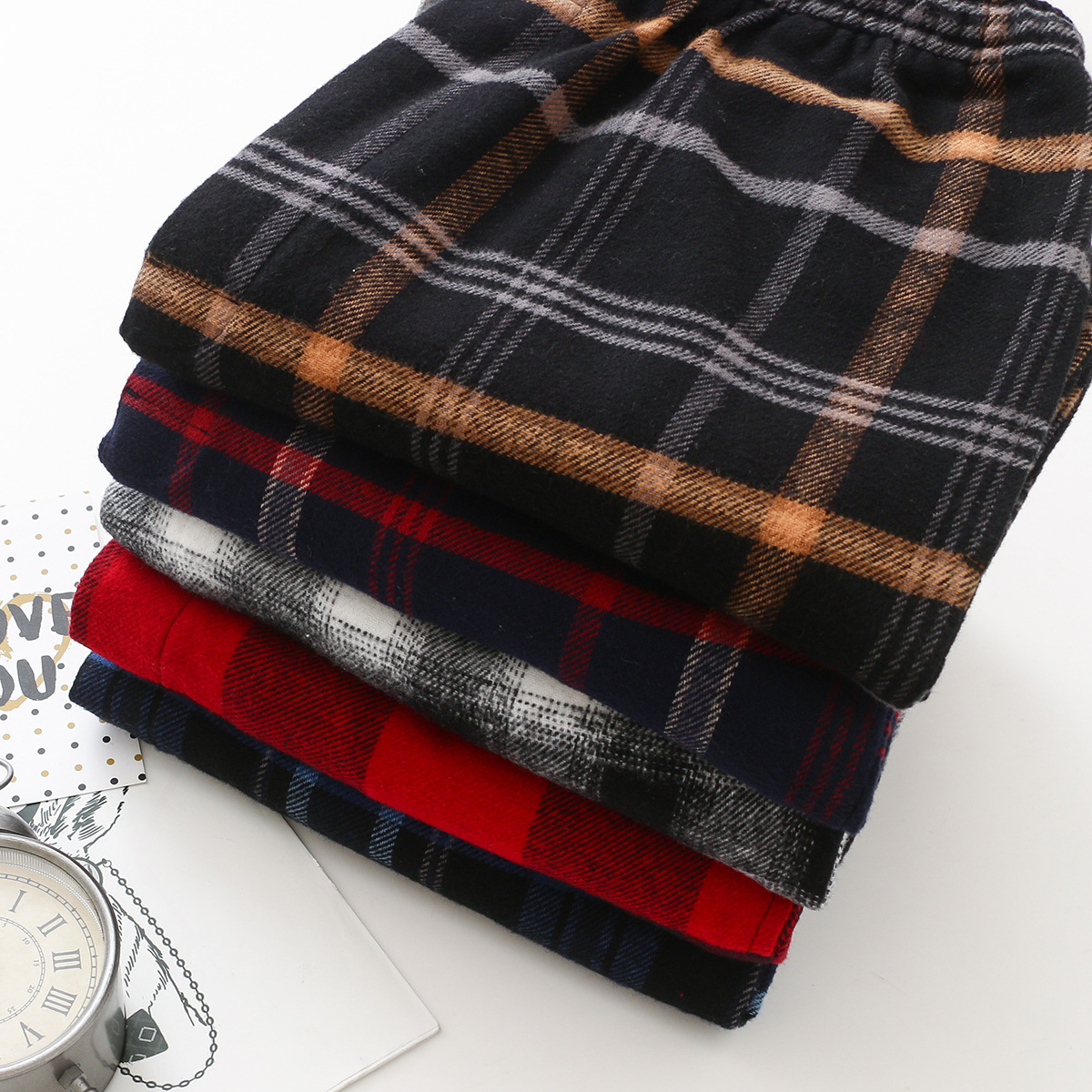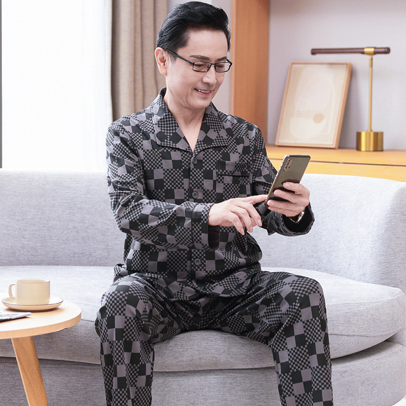 春秋用長袖メンズカーディガン、中年のお父さん向けチェック柄パジャマ、高齢者向け長ズボンセット、ホームウェア卸売