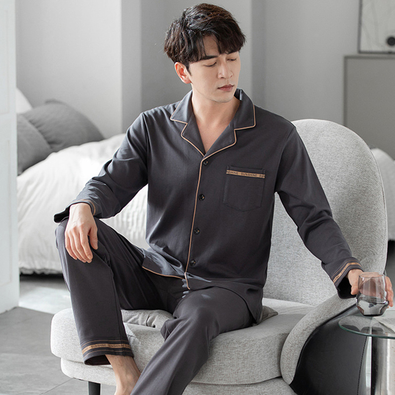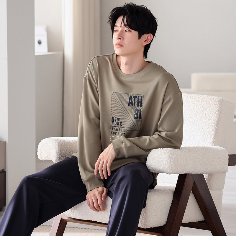 クラスA抗菌100% 純綿パジャマ男性春秋長袖丸襟プラスサイズでホームウェア男性用