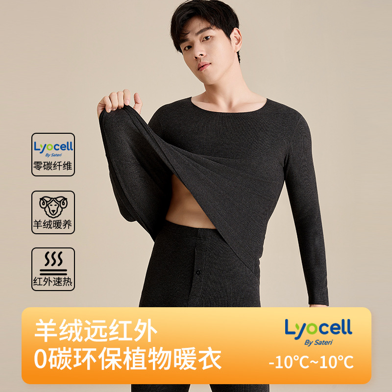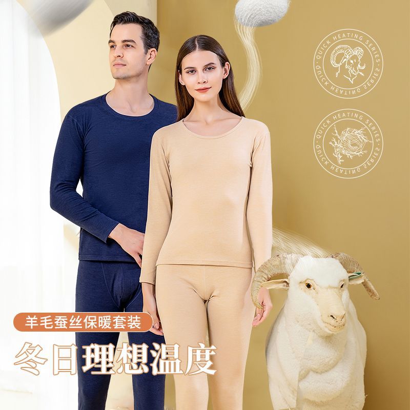 ウールシルクパッチ保温下着男性デコルテ高級両面冬丸襟女性秋衣秋ズボンセット