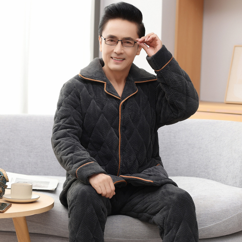 冬のサンゴの毛の男性のパジャマの3層の厚い綿の中年のお父さんのベルベットのフランネルの家の服の冬のスーツ