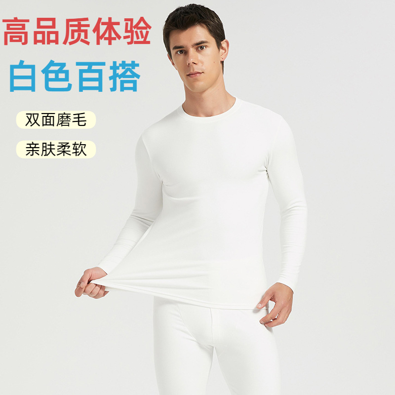 白いメンズラウンドネック保温スーツ、防寒スリムフィット無地両面起毛インナー、レディース秋冬服